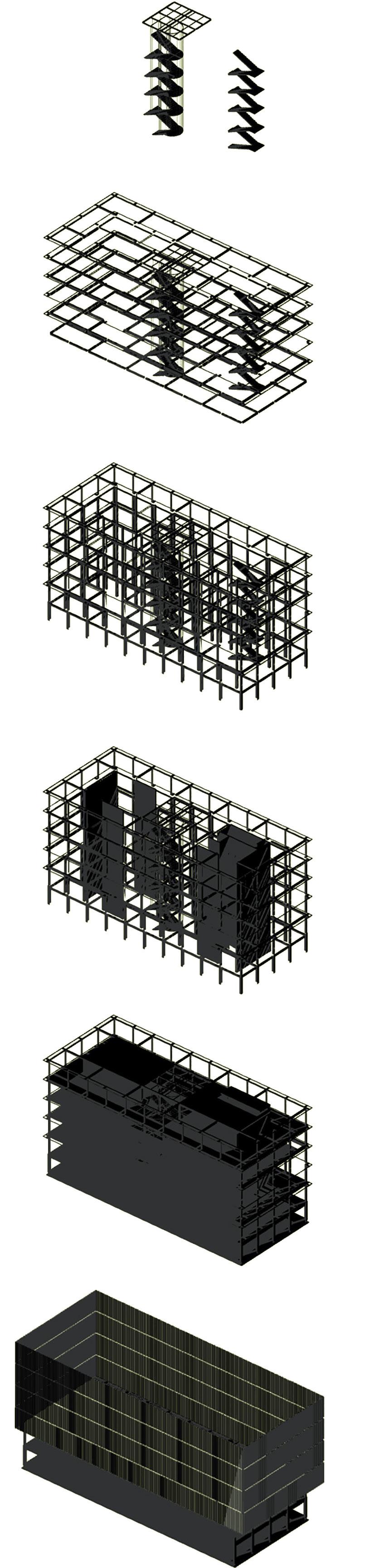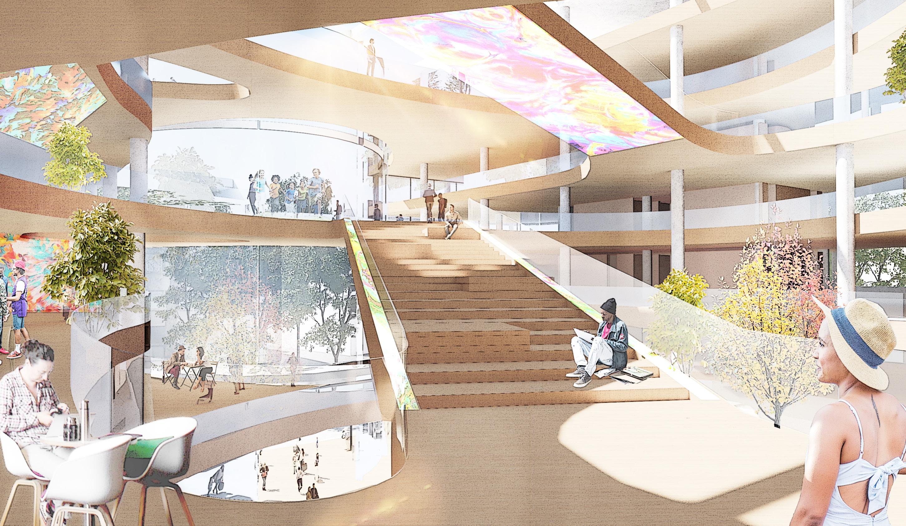 By a synergy between the function and the structure the big staircases will connect the difference floors and at the same time invite people to gathering on.