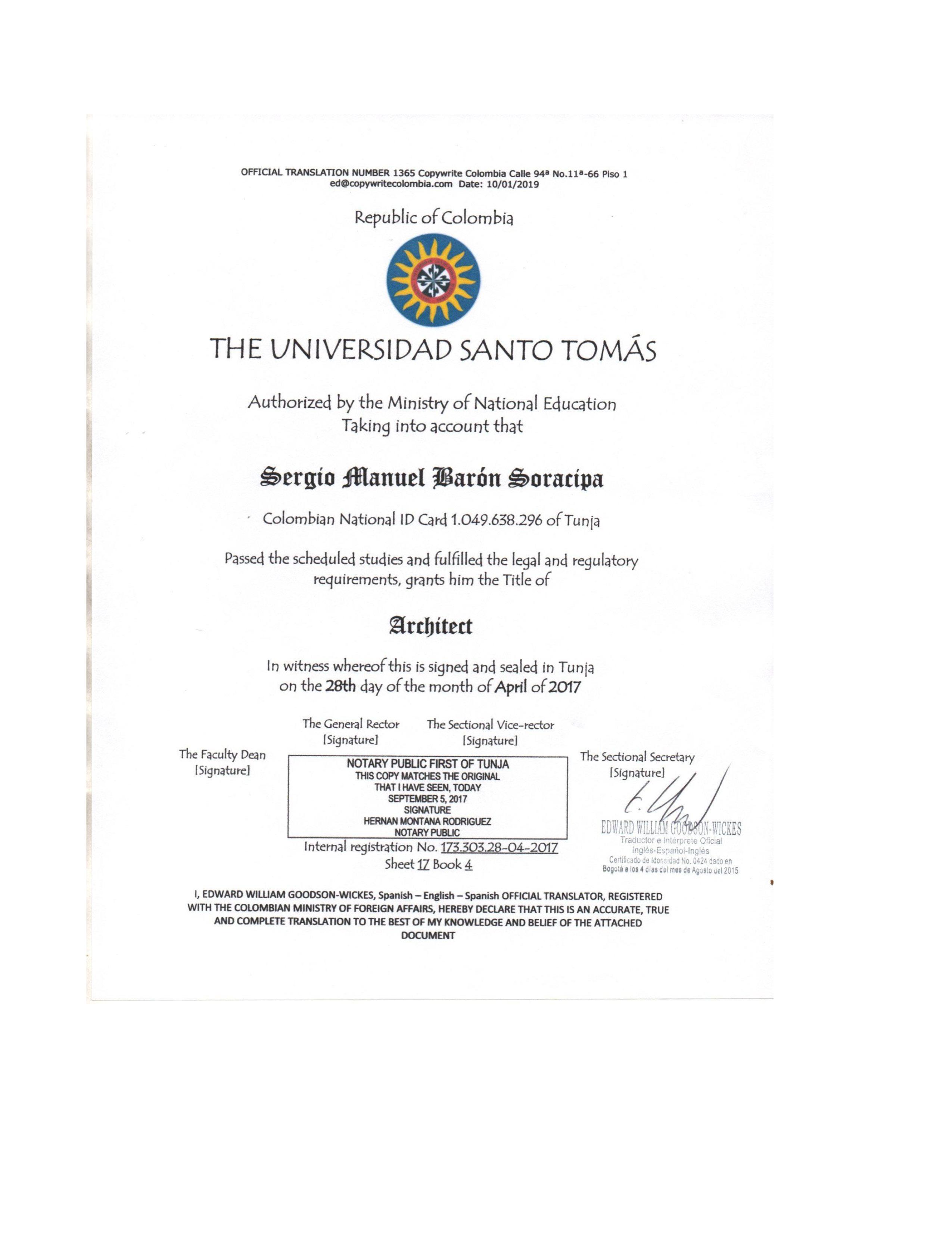 Certi es that Mrs SERGIO MANUEL BARON SORACIPA, Identify with the following passport number AO503630 from Tunja, Colombia. He is under a contract with the company PROIEKT as Architectural Designer, from July the 6 until the present day, and he is earning a payment of 6 Euros per hour.
