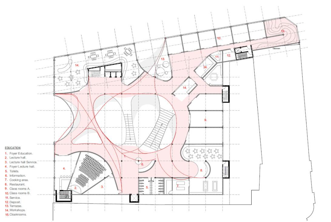 by the upper floor the main reading area and the cafeteria will be located taking advantage of the view and the natural determinants.
