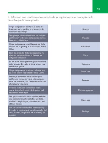 53 II. Relaciona con una línea el enunciado de la izquierda con el concepto de la derecha que le corresponda. Grupo indígena que habitó en el norte de la entidad, en lo que hoy es el territorio del municipio de Mulegé
