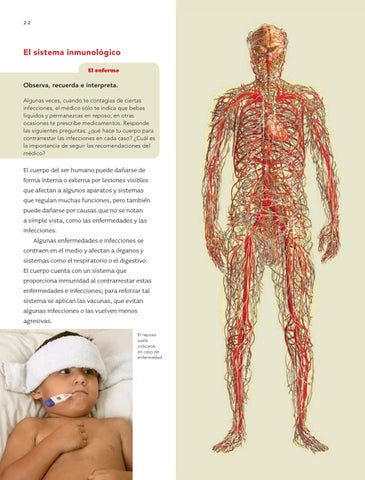 El sistema inmunológico El enfermo Observa, recuerda e interpreta. Algunas veces, cuando te contagias de ciertas infecciones, el médico sólo te indica que bebas líquidos y permanezcas en reposo; en otras ocasiones te prescribe medicamentos. Responde las siguientes preguntas: ¿qué hace tu cuerpo para contrarrestar las infecciones en cada caso? ¿Cuál es la importancia de seguir las recomendaciones del médico?