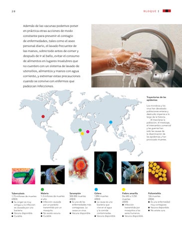 Además de las vacunas podemos poner en práctica otras acciones de modo constante para prevenir el contagio de enfermedades, tales como el aseo personal diario, el lavado frecuente de las manos, sobre todo antes de comer y después de ir al baño, evitar el consumo de alimentos en lugares insalubres que no cuenten con un sistema de lavado de utensilios, alimentos y manos con agua corriente, y extremar estas precauciones cuando se convive con enfermos que padezcan infecciones. Trayectorias de las epidemias Los microbios y los virus han devastado poblaciones enteras y destruido imperios a lo largo de la historia. Al mezclarse la población, el mestizaje, el intercambio comercial y las guerras han sido las causas de la diseminación de las epidemias y han provocado muertes.
