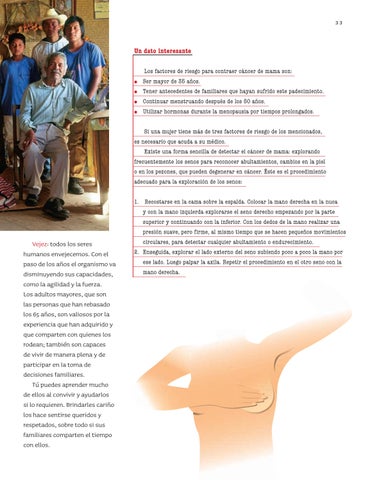 Vejez: todos los seres humanos envejecemos. Con el paso de los años el organismo va disminuyendo sus capacidades, como la agilidad y la fuerza. Los adultos mayores, que son las personas que han rebasado los 65 años, son valiosos por la experiencia que han adquirido y que comparten con quienes los rodean; también son capaces de vivir de manera plena y de participar en la toma de decisiones familiares. Tú puedes aprender mucho de ellos al convivir y ayudarlos si lo requieren. Brindarles cariño los hace sentirse queridos y respetados, sobre todo si sus familiares comparten el tiempo con ellos.