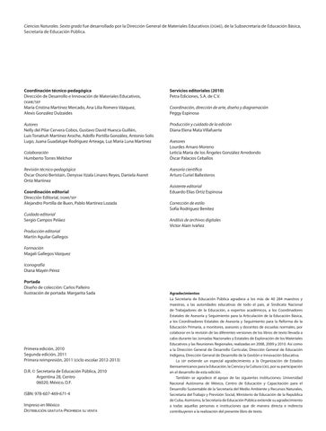 Agradecimientos La Secretaría de Educación Pública agradece a los más de 40 284 maestros y maestras, a las autoridades educativas de todo el país, al Sindicato Nacional de Trabajadores de la Educación, a expertos académicos, a los Coordinadores Estatales de Asesoría y Seguimiento para la Articulación de la Educación Básica, a los Coordinadores Estatales de Asesoría y Seguimiento para la Reforma de la Educación Primaria, a monitores, asesores y docentes de escuelas normales, por colaborar en la revisión de las diferentes versiones de los libros de texto llevada a cabo durante las Jornadas Nacionales y Estatales de Exploración de los Materiales Educativos y las Reuniones Regionales, realizadas en 2008, 2009 y 2010. Así como a la Dirección General de Desarrollo Curricular, Dirección General de Educación Indígena, Dirección General de Desarrollo de la Gestión e Innovación Educativa. La sep extiende un especial agradecimiento a la Organización de Estados Iberoamericanos para la Educación, la Ciencia y la Cultura (oei), por su participación en el desarrollo de esta edición. También se agradece el apoyo de las siguientes instituciones: Universidad Nacional Autónoma de México, Centro de Educación y Capacitación para el Desarrollo Sustentable de la Secretaría del Medio Ambiente y Recursos Naturales, Secretaría del Trabajo y Previsión Social, Ministerio de Educación de la República de Cuba. Asimismo, la Secretaría de Educación Pública extiende su agradecimiento a todas aquellas personas e instituciones que de manera directa e indirecta contribuyeron a la realización del presente libro de texto.