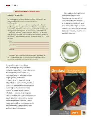 tema 3 Infecciones de transmisión sexual Investiga y describe. En equipos y con la asesoría de su profesor, investiguen las infecciones de transmisión sexual y completen la información. sida. síndrome de inmunodeficiencia adquirida: infección producida por el virus de la inmunodeficiencia humana (vih) que debilita el sistema inmunológico, inactivando a las células encargadas de protegernos de infecciones y enfermedades Papiloma humano: virus que infecta la mucosa de la vagina y puede provocar cáncer cérvico-uterino. Actualmente existe una vacuna para prevenir esta infección. Se aplica desde los 12 años de edad.