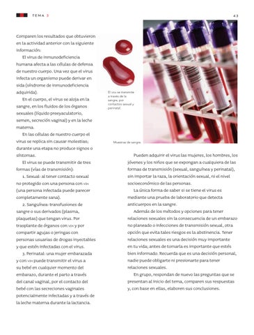 Comparen los resultados que obtuvieron en la actividad anterior con la siguiente información: El virus de inmunodeficiencia humana afecta a las células de defensa de nuestro cuerpo. Una vez que el virus infecta un organismo puede derivar en sida (síndrome de inmunodeficiencia adquirida). En el cuerpo, el virus se aloja en la sangre, en los fluidos de los órganos sexuales (líquido preeyaculatorio, semen, secreción vaginal) y en la leche materna. En las células de nuestro cuerpo el virus se replica sin causar molestias; durante una etapa no produce signos o síntomas. El virus se puede transmitir de tres formas (vías de transmisión): 1. Sexual: al tener contacto sexual no protegido con una persona con vih (una persona infectada puede parecer completamente sana). 2. Sanguínea: transfusiones de sangre o sus derivados (plasma, plaquetas) que tengan virus. Por trasplante de órganos con vih y por compartir agujas o jeringas con personas usuarias de drogas inyectables y que estén infectadas con el virus. 3. Perinatal: una mujer embarazada y con vih puede transmitir el virus a su bebé en cualquier momento del embarazo, durante el parto a través del canal vaginal, por el contacto del bebé con las secreciones vaginales potencialmente infectadas y a través de la leche materna durante la lactancia.