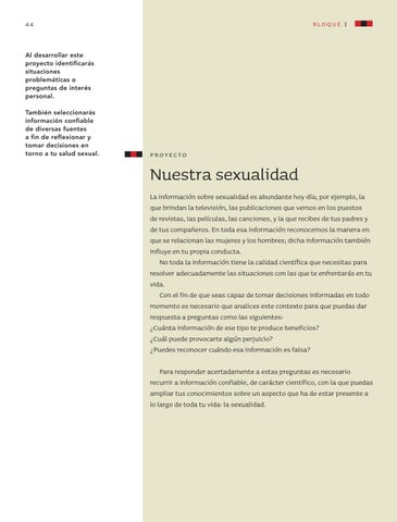 Nuestra sexualidad La información sobre sexualidad es abundante hoy día; por ejemplo, la que brindan la televisión, las publicaciones que vemos en los puestos de revistas, las películas, las canciones, y la que recibes de tus padres y de tus compañeros. En toda esa información reconocemos la manera en que se relacionan las mujeres y los hombres; dicha información también influye en tu propia conducta. No toda la información tiene la calidad científica que necesitas para resolver adecuadamente las situaciones con las que te enfrentarás en tu vida. Con el fin de que seas capaz de tomar decisiones informadas en todo momento es necesario que analices este contexto para que puedas dar respuesta a preguntas como las siguientes: ¿Cuánta información de ese tipo te produce beneficios? ¿Cuál puede provocarte algún perjuicio? ¿Puedes reconocer cuándo esa información es falsa? Para responder acertadamente a estas preguntas es necesario recurrir a información confiable, de carácter científico, con la que puedas ampliar tus conocimientos sobre un aspecto que ha de estar presente a lo largo de toda tu vida: la sexualidad.
