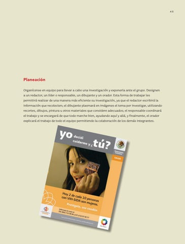 Planeación Organícense en equipo para llevar a cabo una investigación y exponerla ante el grupo. Designen a un redactor, un líder o responsable, un dibujante y un orador. Esta forma de trabajar les permitirá realizar de una manera más eficiente su investigación, ya que el redactor escribirá la información que recolecten; el dibujante plasmará en imágenes el tema por investigar, utilizando recortes, dibujos, pintura u otros materiales que considere adecuados; el responsable coordinará el trabajo y se encargará de que todo marche bien, ayudando aquí y allá, y finalmente, el orador explicará el trabajo de todo el equipo permitiendo la colaboración de los demás integrantes.