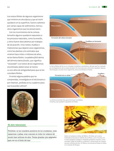Los restos fósiles de algunos organismos que vivieron en otra época y que al morir quedaron en la superficie, fueron cubiertos por varias capas de sedimentos, tierra y otros organismos que los preservaron. Con los movimientos de la corteza terrestre algunos quedaron expuestos a los procesos naturales, como la erosión, y otros fueron descubiertos por trabajos de excavación. A los restos, huellas e impresiones que dejaron esos organismos, como las plantas y los animales que vivieron hace miles o millones de años, se les llama fósiles. La palabra fósil deriva del término latino fossilis, que significa “excavado”. Los restos de los organismos encontrados deben tener al menos 10 000 años de antigüedad para que se les considere fósiles. Si existe alguna palabra que no comprendas, investígala en el diccionario o por internet. ¡Anótala en tu cuaderno para que la puedas utilizar!