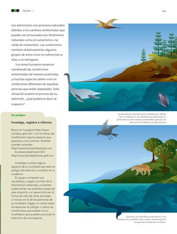 Busca en la página http://www. conabio.gob.mx/ o en los libros de la biblioteca alguna especie que aparezca como extinta. También puedes consultar: http//www.bodiversidad.gob.mx/ biodiversidad/crisis.html http//www.fansdelplaneta.gob.mx Investiga si existe alguna especie de tu localidad que esté en peligro de extinción y anótala en tu cuaderno. En grupo comparen sus resultados y hagan una lista de la información obtenida, comenten cuáles serían las posibles causas de esta situación y si repercutiría en la forma de vida de otros animales, o incluso en la de las personas de su localidad. Hagan un cartel sobre las especies en peligro o sobre las condiciones que existen en su localidad y que pueden provocar la extinción de una especie.
