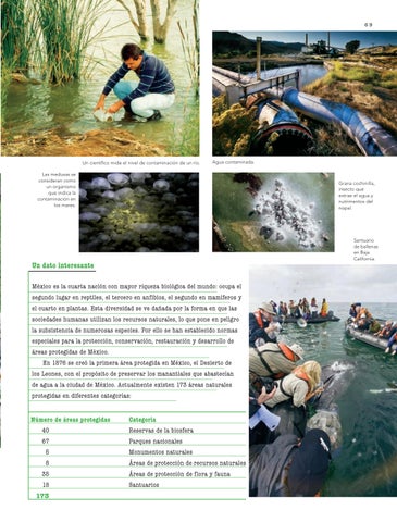 Un dato interesante México es la cuarta nación con mayor riqueza biológica del mundo: ocupa el segundo lugar en reptiles, el tercero en anfibios, el segundo en mamíferos y el cuarto en plantas. Esta diversidad se ve dañada por la forma en que las sociedades humanas utilizan los recursos naturales, lo que pone en peligro la subsistencia de numerosas especies. Por ello se han establecido normas especiales para la protección, conservación, restauración y desarrollo de áreas protegidas de México. En 1876 se creó la primera área protegida en México, el Desierto de los Leones, con el propósito de preservar los manantiales que abastecían de agua a la ciudad de México. Actualmente existen 173 áreas naturales protegidas en diferentes categorías: Número de áreas protegidas