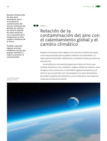 Relación de la contaminación del aire con el calentamiento global y el cambio climático Respirar el aire para tomar oxígeno es un acto tan cotidiano que quizá nunca hayas pensado que no podrías realizarlo sin la atmósfera. Tú sabes qué es la atmósfera. Reflexionen y comenten la idea que tienen de este término. La atmósfera es una mezcla de gases que rodea a la Tierra y que contiene elementos como: nitrógeno, oxígeno, dióxido de carbono, vapor de agua y ozono, entre otros. La atmósfera regula la temperatura y el clima, lo que nos permite vivir, nos protege de los rayos ultravioleta y de posibles impactos de meteoritos, y es el medio por el cual viajan las ondas para la telecomunicación.