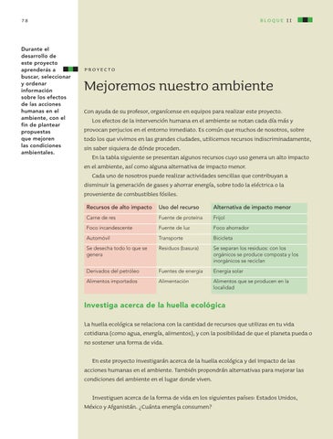 Mejoremos nuestro ambiente Con ayuda de su profesor, organícense en equipos para realizar este proyecto. Los efectos de la intervención humana en el ambiente se notan cada día más y provocan perjucios en el entorno inmediato. Es común que muchos de nosotros, sobre todo los que vivimos en las grandes ciudades, utilicemos recursos indiscriminadamente, sin saber siquiera de dónde proceden. En la tabla siguiente se presentan algunos recursos cuyo uso genera un alto impacto en el ambiente, así como alguna alternativa de impacto menor. Cada uno de nosotros puede realizar actividades sencillas que contribuyan a disminuir la generación de gases y ahorrar energía, sobre todo la eléctrica o la proveniente de combustibles fósiles. Recursos de alto impacto