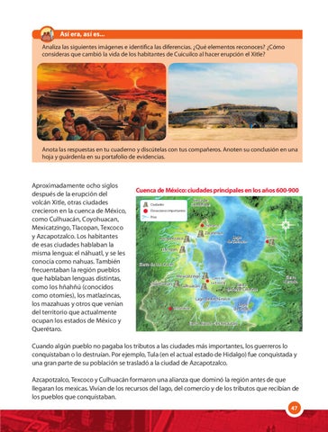 Aproximadamente ocho siglos después de la erupción del volcán Xitle, otras ciudades crecieron en la cuenca de México, como Culhuacán, Coyohuacan, Mexicatzingo, Tlacopan, Texcoco y Azcapotzalco. Los habitantes de esas ciudades hablaban la misma lengua: el náhuatl, y se les conocía como nahuas. También frecuentaban la región pueblos que hablaban lenguas distintas, como los hñahñú (conocidos como otomíes), los matlazincas, los mazahuas y otros que venían del territorio que actualmente ocupan los estados de México y Querétaro.