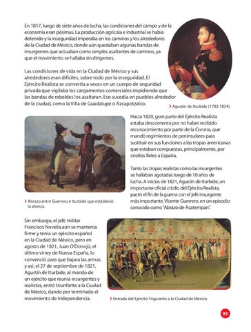 En 1817, luego de siete años de lucha, las condiciones del campo y de la economía eran pésimas. La producción agrícola e industrial se había detenido y la inseguridad imperaba en los caminos y los alrededores de la Ciudad de México, donde aún quedaban algunas bandas de insurgentes que actuaban como simples asaltantes de caminos, ya que el movimiento se hallaba sin dirigentes. Las condiciones de vida en la Ciudad de México y sus alrededores eran difíciles, sobre todo por la inseguridad. El Ejército Realista se convertía a veces en un cuerpo de seguridad privada que vigilaba los cargamentos comerciales impidiendo que las bandas de rebeldes los asaltaran. Eso sucedía en pueblos alrededor de la ciudad, como la Villa de Guadalupe o Azcapotzalco. ❯❯Agustín de Iturbide (1783-1824). Hacia 1820, gran parte del Ejército Realista estaba descontento por no haber recibido reconocimiento por parte de la Corona, que mandó regimientos de peninsulares para sustituir en sus funciones a las tropas americanas que estaban compuestas, principalmente, por criollos fieles a España.