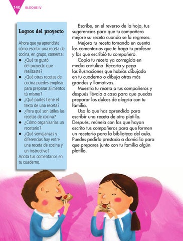 Logros del proyecto Ahora que ya aprendiste cómo escribir una receta de cocina, en grupo, comenta: z ¿Qué te gustó del proyecto que realizaste? z ¿Qué otras recetas de cocina puedes emplear para preparar alimentos tú mismo? z ¿Qué partes tiene el texto de una receta? z ¿Para qué son útiles las recetas de cocina? z ¿Cómo organizarías un recetario? z ¿Qué semejanzas y diferencias hay entre una receta de cocina y un instructivo? Anota tus comentarios en tu cuaderno.