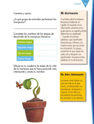 En el texto sobre la mariposa Monarca se habla de un capullo. De acuerdo con la información, comenta con tu grupo qué es un capullo y juntos determinen su significado. Cuando encuentres palabras cuyo significado desconozcas, informa a tu maestro para que las anote en el pizarrón. En grupo, comenten lo que sepan de cada una y busquen sus significados. Incorpora estas palabras en tu diccionario.