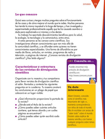 Lo que conozco Quizá seas curioso y tengas muchas preguntas sobre el funcionamiento de las cosas y de cómo mejorar el mundo que te rodea. Muchas personas han tenido la misma inquietud a lo largo del tiempo, y han investigado y experimentado profesionalmente aquello que les ha causado asombro o duda para explicárselo a sí mismas y a los demás. Su trabajo ha aportado descubrimientos benéficos para la salud, la ecología, la tecnología y la astronáutica, entre otros. A estas personas se les conoce como científicos. Sus investigaciones ofrecen conocimientos que van más allá de la comunidad científica, y se difunden entre quienes no tienen conocimientos especializados. Una forma de difundirlos es por medio de libros, artículos, en revistas, programas de radio y televisión, o páginas de internet. ¿Conoces revistas de divulgación científica? ¿Has leído alguna?