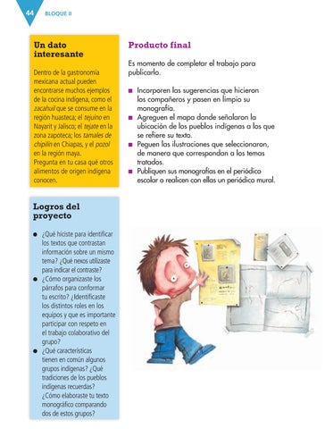 Producto final Es momento de completar el trabajo para publicarlo. Incorporen las sugerencias que hicieron los compañeros y pasen en limpio su monografía. ■ Agreguen el mapa donde señalaron la ubicación de los pueblos indígenas a los que se refiere su texto. ■ Peguen las ilustraciones que seleccionaron, de manera que correspondan a los temas tratados. ■ Publiquen sus monografías en el periódico escolar o realicen con ellas un periódico mural. ■