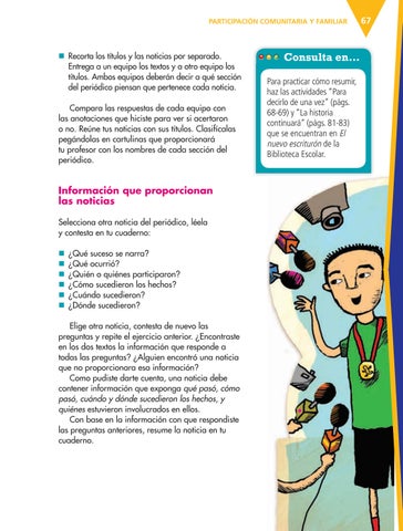 Consulta en… Para practicar cómo resumir, haz las actividades “Para decirlo de una vez” (págs. 68-69) y “La historia continuará” (págs. 81-83) que se encuentran en El nuevo escriturón de la Biblioteca Escolar.