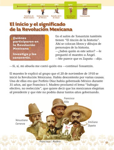 —Sí, sí, mi abuela me contó quién era —continuó Tonantzin. El maestro le explicó al grupo que el 20 de noviembre de 1910 se inició la Revolución Mexicana. Había descontento por varias causas. Una de ellas era que Porfirio Díaz había gobernado México durante 31 años, así que Francisco I. Madero proclamó el lema “Sufragio efectivo, no reelección”, que quiere decir que los mexicanos elegirían al presidente y que éste no podría durar tantos años gobernando.