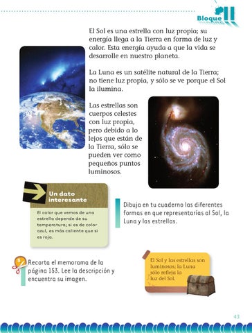 El Sol es una estrella con luz propia; su energía llega a la Tierra en forma de luz y calor. Esta energía ayuda a que la vida se desarrolle en nuestro planeta. La Luna es un satélite natural de la Tierra; no tiene luz propia, y sólo se ve porque el Sol la ilumina. Las estrellas son cuerpos celestes con luz propia, pero debido a lo lejos que están de la Tierra, sólo se pueden ver como pequeños puntos luminosos.