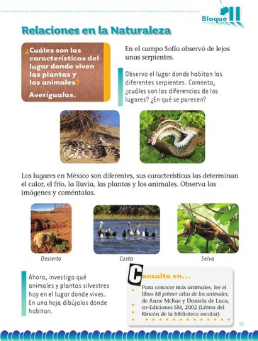 onsulta en... Para conocer más animales, lee el libro Mi primer atlas de los animales, de Anne McRae y Daniela de Luca, sep-Ediciones SM, 2002 (Libros del Rincón de la biblioteca escolar).