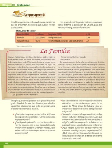 Lo que aprendí Lee el texto y resuelve en tu cuaderno las cuestiones Un grupo de quinto grado realiza su ceremonia que se presentan. Recuerda que puedes revisar sobre el tema la población de Ghana, para ello tus lecciones. encontró la siguiente información: Ghana, al sur del Sahara* Población (2006) 23 millones Emigrantes (2005) 4.1% Extensión 232 320 km2 Inmigrantes (2005) 7.6% Población urbana 48.5% Crecimiento poblacional por cada 100 habitantes 2.2 * Banco Mundial, 2008.