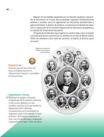 Comprendo y aplico Reúnanse en equipos y busquen el significado de las palabras soberanía y democracia. Redacten en una cartulina una frase en la que señalen la importancia de la soberanía y la democracia en la actualidad; les sugerimos tomar como ejemplo la frase de Juárez. Al terminar, compartan su frase con el resto del grupo, explíquenla y péguenla en un lugar visible del salón.