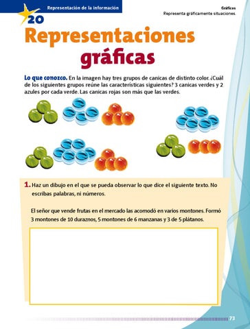 1. Haz un dibujo en el que se pueda observar lo que dice el siguiente texto. No escribas palabras, ni números. El señor que vende frutas en el mercado las acomodó en varios montones. Formó 3 montones de 10 duraznos, 5 montones de 6 manzanas y 3 de 5 plátanos.