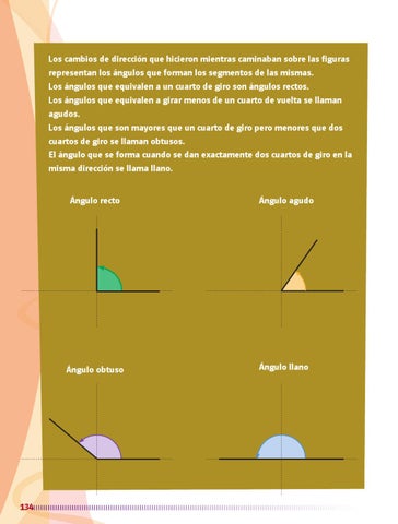 Los cambios de dirección que hicieron mientras caminaban sobre las figuras representan los ángulos que forman los segmentos de las mismas. Los ángulos que equivalen a un cuarto de giro son ángulos rectos. Los ángulos que equivalen a girar menos de un cuarto de vuelta se llaman agudos. Los ángulos que son mayores que un cuarto de giro pero menores que dos cuartos de giro se llaman obtusos. El ángulo que se forma cuando se dan exactamente dos cuartos de giro en la misma dirección se llama llano. Ángulo recto