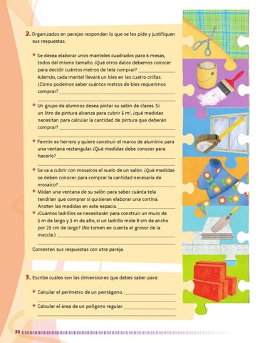 todos del mismo tamaño. ¿Qué otros datos debemos conocer para decidir cuántos metros de tela comprar? Además, cada mantel llevará un bies en las cuatro orillas. ¿Cómo podemos saber cuántos metros de bies requerimos comprar? ❖ Un grupo de alumnos desea pintar su salón de clases. Si un litro de pintura alcanza para cubrir 5 m2, ¿qué medidas necesitan para calcular la cantidad de pintura que deberán comprar? ❖ Fermín es herrero y quiere construir el marco de aluminio para una ventana rectangular. ¿Qué medidas debe conocer para hacerlo? ❖ Se va a cubrir con mosaicos el suelo de un salón. ¿Qué medidas se deben conocer para comprar la cantidad necesaria de mosaico? ❖ Midan una ventana de su salón para saber cuánta tela tendrían que comprar si quisieran elaborar una cortina. Anoten las medidas en este espacio. ❖ ¿Cuántos ladrillos se necesitarán para construir un muro de 5 m de largo y 3 m de alto, si un ladrillo mide 8 cm de ancho por 25 cm de largo? (No tomen en cuenta el grosor de la mezcla.) Comenten sus respuestas con otra pareja.