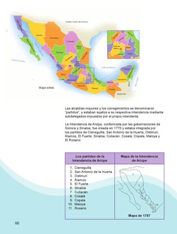 Las alcaldías mayores y los corregimientos se denominaron “partidos”, y estaban sujetos a su respectiva intendencia mediante subdelegados impuestos por el propio intendente. La Intendencia de Arizpe, conformada por las gobernaciones de Sonora y Sinaloa, fue creada en 1770 y estaba integrada por los partidos de Cieneguilla, San Antonio de la Huerta, Ostimuri, Álamos, El Fuerte, Sinaloa, Culiacán, Cosalá, Copala, Maloya y El Rosario.