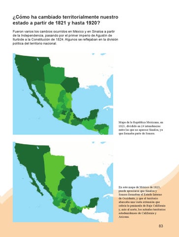 ¿Cómo ha cambiado territorialmente nuestro estado a partir de 1821 y hasta 1920? Fueron varios los cambios ocurridos en México y en Sinaloa a partir de la Independencia, pasando por el primer imperio de Agustín de Iturbide a la Constitución de 1824. Algunos se reflejaban en la división política del territorio nacional.