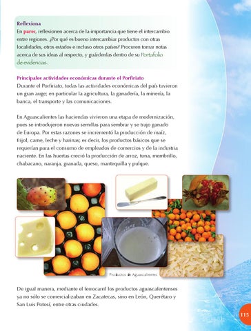 Reflexiona En pares, reflexionen acerca de la importancia que tiene el intercambio entre regiones. ¿Por qué es bueno intercambiar productos con otras localidades, otros estados e incluso otros países? Procuren tomar notas acerca de sus ideas al respecto, y guárdenlas dentro de su Portafolio de evidencias. Principales actividades económicas durante el Porfiriato Durante el Porfiriato, todas las actividades económicas del país tuvieron un gran auge; en particular la agricultura, la ganadería, la minería, la banca, el transporte y las comunicaciones. En Aguascalientes las haciendas vivieron una etapa de modernización, pues se introdujeron nuevas semillas para sembrar y se trajo ganado de Europa. Por estas razones se incrementó la producción de maíz, frijol, carne, leche y harinas; es decir, los productos básicos que se requerían para el consumo de empleados de comercios y de la industria naciente. En las huertas creció la producción de arroz, tuna, membrillo, chabacano, naranja, granada, queso, mantequilla y pulque.