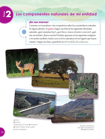 Los componentes naturales de mi entidad ¡En sus marcas! Comenta con tu profesor y tus compañeros sobre las características naturales de Aguascalientes. En pares, hagan una lista de los siguientes elementos naturales: ¿qué montañas hay?, ¿qué flora y fauna silvestre conocen?, ¿qué ríos recuerdan?, ¿llueve mucho? Pueden apoyarse en las siguientes imágenes y recuerden también charlar acerca de la naturaleza de los lugares que hayan visitado. Hagan una lista y guárdenla en el Portafolio de evidencias.