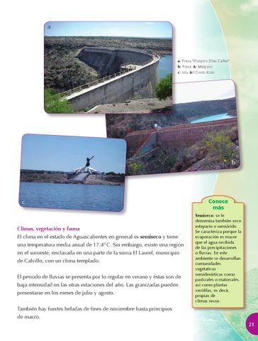 Climas, vegetación y fauna El clima en el estado de Aguascalientes en general es semiseco y tiene una temperatura media anual de 17.4° C. Sin embargo, existe una región en el suroeste, enclavada en una parte de la sierra El Laurel, municipio de Calvillo, con un clima templado. El periodo de lluvias se presenta por lo regular en verano y éstas son de baja intensidad en las otras estaciones del año. Las granizadas pueden presentarse en los meses de julio y agosto.