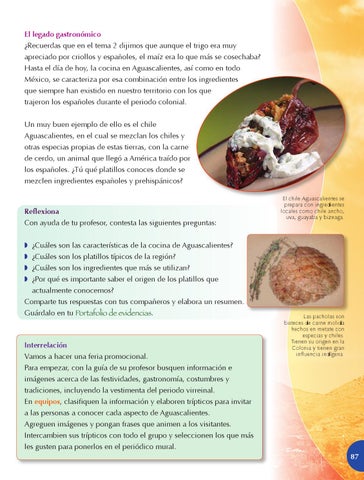 Reflexiona Con ayuda de tu profesor, contesta las siguientes preguntas: ◗◗ ¿Cuáles son las características de la cocina de Aguascalientes? ◗◗ ¿Cuáles son los platillos típicos de la región? ◗◗ ¿Cuáles son los ingredientes que más se utilizan? ◗◗ ¿Por qué es importante saber el origen de los platillos que actualmente conocemos? Comparte tus respuestas con tus compañeros y elabora un resumen. Guárdalo en tu Portafolio de evidencias.