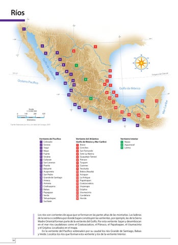 Los ríos son corrientes de agua que se forman en las partes altas de las montañas. Las laderas de la sierra o cordillera por donde bajan constituyen las vertientes, por ejemplo, las de la Sierra Madre Oriental forman parte de la vertiente del Golfo. Por esta vertiente bajan y desembocan en el mar ríos caudalosos como el Coatzacoalcos, el Pánuco, el Papaloapan, el Usumacinta y el Grijalva. Localízalos en el mapa. En la vertiente del Pacífico sobresalen por su caudal los ríos Grande de Santiago, Balsas y Verde. Localiza los ríos que forman esta vertiente y los de la vertiente Interior. 14 ATLASMEXICO-P-009-018.indd 14