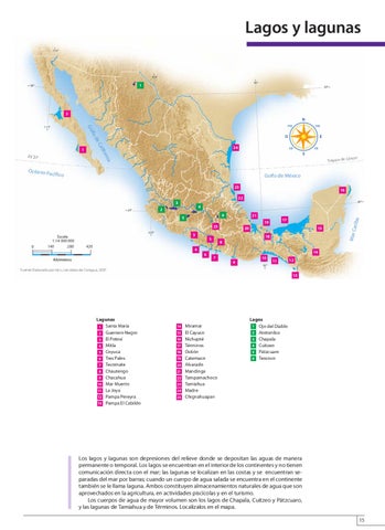 Los lagos y lagunas son depresiones del relieve donde se depositan las aguas de manera permanente o temporal. Los lagos se encuentran en el interior de los continentes y no tienen comunicación directa con el mar; las lagunas se localizan en las costas y se encuentran separadas del mar por barras; cuando un cuerpo de agua salada se encuentra en el continente también se le llama laguna. Ambos constituyen almacenamientos naturales de agua que son aprovechados en la agricultura, en actividades piscícolas y en el turismo. Los cuerpos de agua de mayor volumen son los lagos de Chapala, Cuitzeo y Pátzcuaro, y las lagunas de Tamiahua y de Términos. Localízalos en el mapa. 15 ATLASMEXICO-P-009-018.indd 15