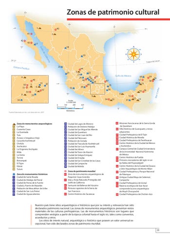 Nuestro país tiene sitios arqueológicos e históricos que por su interés y relevancia han sido declarados patrimonio nacional. Las zonas de monumentos arqueológicos presentan restos materiales de las culturas prehispánicas. Las de monumentos históricos son lugares que comprenden vestigios a partir de la época colonial hasta el siglo xix, tales como conventos, acueductos y otros. Los sitios de interés natural, arqueológico o histórico que poseen un valor universal excepcional, han sido declarados zonas de patrimonio mundial. 23 ATLASMEXICO-P-019-024.indd 23