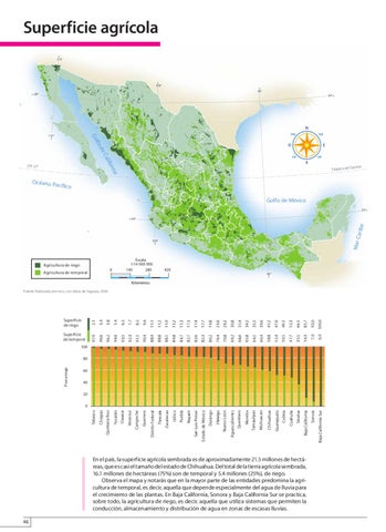 En el país, la superficie agrícola sembrada es de aproximadamente 21.5 millones de hectáreas, que es casi el tamaño del estado de Chihuahua. Del total de la tierra agrícola sembrada, 16.1 millones de hectáreas (75%) son de temporal y 5.4 millones (25%), de riego. Observa el mapa y notarás que en la mayor parte de las entidades predomina la agricultura de temporal, es decir, aquella que depende especialmente del agua de lluvia para el crecimiento de las plantas. En Baja California, Sonora y Baja California Sur se practica, sobre todo, la agricultura de riego, es decir, aquella que utiliza sistemas que permiten la conducción, almacenamiento y distribución de agua en zonas de escasas lluvias. 46 ATLASMEXICO-P-045-048.indd 46