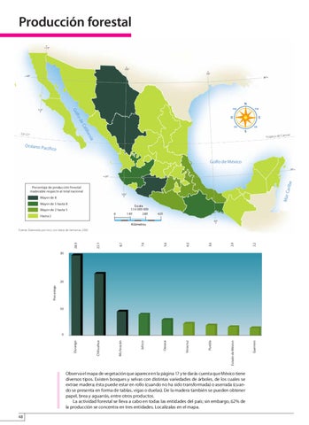 Observa el mapa de vegetación que aparece en la página 17 y te darás cuenta que México tiene diversos tipos. Existen bosques y selvas con distintas variedades de árboles, de los cuales se extrae madera; ésta puede estar en rollo (cuando no ha sido transformada) o aserrada (cuando se presenta en forma de tablas, vigas o duelas). De la madera también se pueden obtener papel, brea y aguarrás, entre otros productos. La actividad forestal se lleva a cabo en todas las entidades del país; sin embargo, 62% de la producción se concentra en tres entidades. Localízalas en el mapa. 48 ATLASMEXICO-P-045-048.indd 48