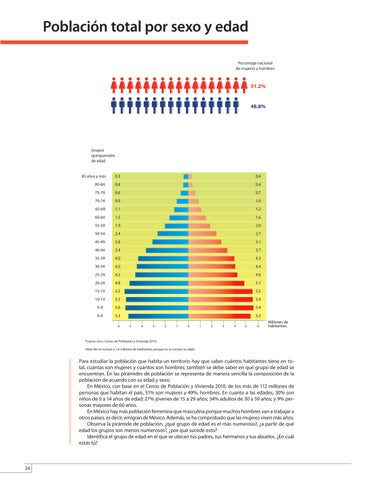 Para estudiar la población que habita un territorio hay que saber cuántos habitantes tiene en total, cuántas son mujeres y cuántos son hombres; también se debe saber en qué grupo de edad se encuentran. En las pirámides de población se representa de manera sencilla la composición de la población de acuerdo con su edad y sexo. En México, con base en el Censo de Población y Vivienda 2010, de los más de 112 millones de personas que habitan el país, 51% son mujeres y 49%, hombres. En cuanto a las edades, 30% son niños de 0 a 14 años de edad; 27% jóvenes de 15 a 29 años; 34% adultos de 30 a 59 años; y 9% personas mayores de 60 años. En México hay más población femenina que masculina porque muchos hombres van a trabajar a otros países, es decir, emigran de México. Además, se ha comprobado que las mujeres viven más años. Observa la pirámide de población, ¿qué grupo de edad es el más numeroso?, ¿a partir de qué edad los grupos son menos numerosos?, ¿por qué sucede esto? Identifica el grupo de edad en el que se ubican tus padres, tus hermanos y tus abuelos. ¿En cuál estás tú?