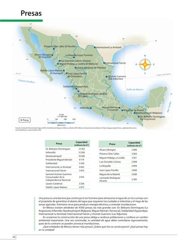 Una presa es una barrera que construye el ser humano para almacenar el agua de un río o arroyo con el propósito de garantizar el abasto del agua que requieren las ciudades e industrias y el riego de las zonas agrícolas. Asimismo sirve para producir energía eléctrica y controlar inundaciones. En México existen alrededor de 4 000 presas; las más grandes son: Dr. Belisario Domínguez (La Angostura), Infiernillo, Nezahualcóyotl (Malpaso), Miguel Alemán (Temascal), Solidaridad (Aguamilpa), Internacional La Amistad, Internacional Falcón y Vicente Guerrero (Las Adjuntas). En ocasiones la construcción de una presa obliga a reubicar poblaciones y conlleva un cambio ambiental importante. Una vez construida, la cantidad de agua debe controlarse rigurosamente, pues de lo contrario se pueden provocar inundaciones. ¿Qué entidades de México tienen más presas? ¿Sobre qué ríos se construyeron? ¿Qué presas hay en tu entidad? 44