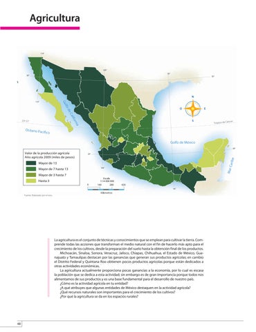La agricultura es el conjunto de técnicas y conocimientos que se emplean para cultivar la tierra. Comprende todas las acciones que transforman el medio natural con el fin de hacerlo más apto para el crecimiento de los cultivos, desde la preparación del suelo hasta la obtención final de los productos. Michoacán, Sinaloa, Sonora, Veracruz, Jalisco, Chiapas, Chihuahua, el Estado de México, Guanajuato y Tamaulipas destacan por las ganancias que generan sus productos agrícolas; en cambio el Distrito Federal y Quintana Roo obtienen pocos productos agrícolas porque están dedicados a otras actividades económicas. La agricultura actualmente proporciona pocas ganancias a la economía, por lo cual es escasa la población que se dedica a esta actividad; sin embargo es de gran importancia porque todos nos alimentamos de sus productos y es una base fundamental para el desarrollo de nuestro país. ¿Cómo es la actividad agrícola en tu entidad? ¿A qué atribuyes que algunas entidades de México destaquen en la actividad agrícola? ¿Qué recursos naturales son importantes para el crecimiento de los cultivos? ¿Por qué la agricultura se da en los espacios rurales?