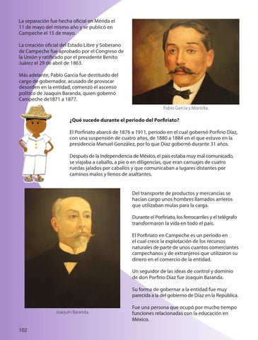 ¿Qué sucede durante el periodo del Porfiriato? El Porfiriato abarcó de 1876 a 1911, periodo en el cual gobernó Porfirio Díaz, con una suspensión de cuatro años, de 1880 a 1884 en el que estuvo en la presidencia Manuel González, por lo que Díaz gobernó durante 31 años. Después de la Independencia de México, el país estaba muy mal comunicado, se viajaba a caballo, a pie o en diligencias, que eran carruajes de cuatro ruedas jalados por caballos y que comunicaban a lugares distantes por caminos malos y llenos de asaltantes. Del transporte de productos y mercancías se hacían cargo unos hombres llamados arrieros que utilizaban mulas para la carga. Durante el Porfiriato, los ferrocarriles y el telégrafo transformaron la vida en todo el país. El Porfiriato en Campeche es un periodo en el cual crece la explotación de los recursos naturales de parte de unos cuantos comerciantes campechanos y de extranjeros que utilizaron su dinero en el comercio de la entidad. Un seguidor de las ideas de control y dominio de don Porfirio Díaz fue Joaquín Baranda. Su forma de gobernar a la entidad fue muy parecida a la del gobierno de Díaz en la República. Joaquín Baranda.