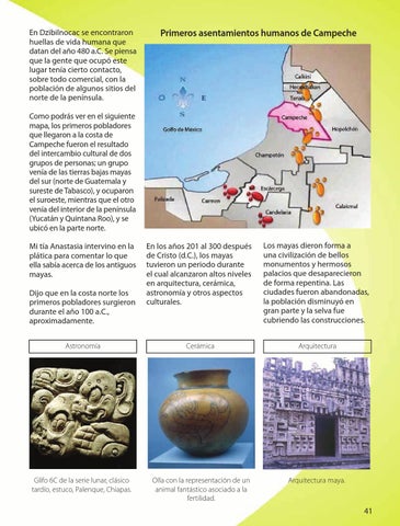 Como podrás ver en el siguiente mapa, los primeros pobladores que llegaron a la costa de Campeche fueron el resultado del intercambio cultural de dos grupos de personas; un grupo venía de las tierras bajas mayas del sur (norte de Guatemala y sureste de Tabasco), y ocuparon el suroeste, mientras que el otro venía del interior de la península (Yucatán y Quintana Roo), y se ubicó en la parte norte. En los años 201 al 300 después de Cristo (d.C.), los mayas tuvieron un periodo durante el cual alcanzaron altos niveles en arquitectura, cerámica, astronomía y otros aspectos culturales.