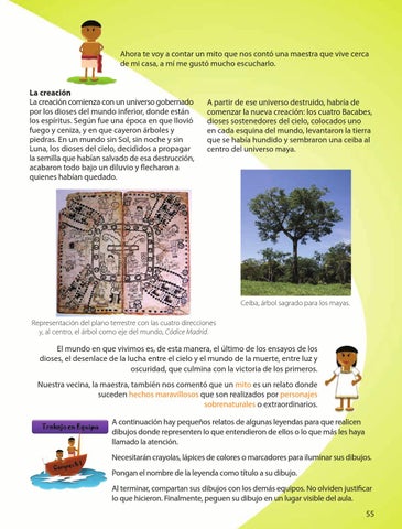 El mundo en que vivimos es, de esta manera, el último de los ensayos de los dioses, el desenlace de la lucha entre el cielo y el mundo de la muerte, entre luz y oscuridad, que culmina con la victoria de los primeros. Nuestra vecina, la maestra, también nos comentó que un mito es un relato donde suceden hechos maravillosos que son realizados por personajes sobrenaturales o extraordinarios. A continuación hay pequeños relatos de algunas leyendas para que realicen dibujos donde representen lo que entendieron de ellos o lo que más les haya llamado la atención. Necesitarán crayolas, lápices de colores o marcadores para iluminar sus dibujos. Pongan el nombre de la leyenda como título a su dibujo. Al terminar, compartan sus dibujos con los demás equipos. No olviden justificar lo que hicieron. Finalmente, peguen su dibujo en un lugar visible del aula. 55 Campeche-estatal-001-160 55
