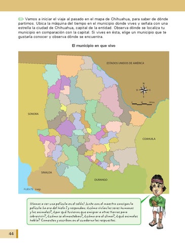 Vamos a iniciar el viaje al pasado en el mapa de Chihuahua, para saber de dónde partimos. Ubica la máquina del tiempo en el municipio donde vives y señala con una estrella la ciudad de Chihuahua, capital de la entidad. Observa dónde se localiza tu municipio en comparación con la capital. Si vives en ésta, elige un municipio que te gustaría conocer y observa dónde se encuentra. El municipio en que vivo